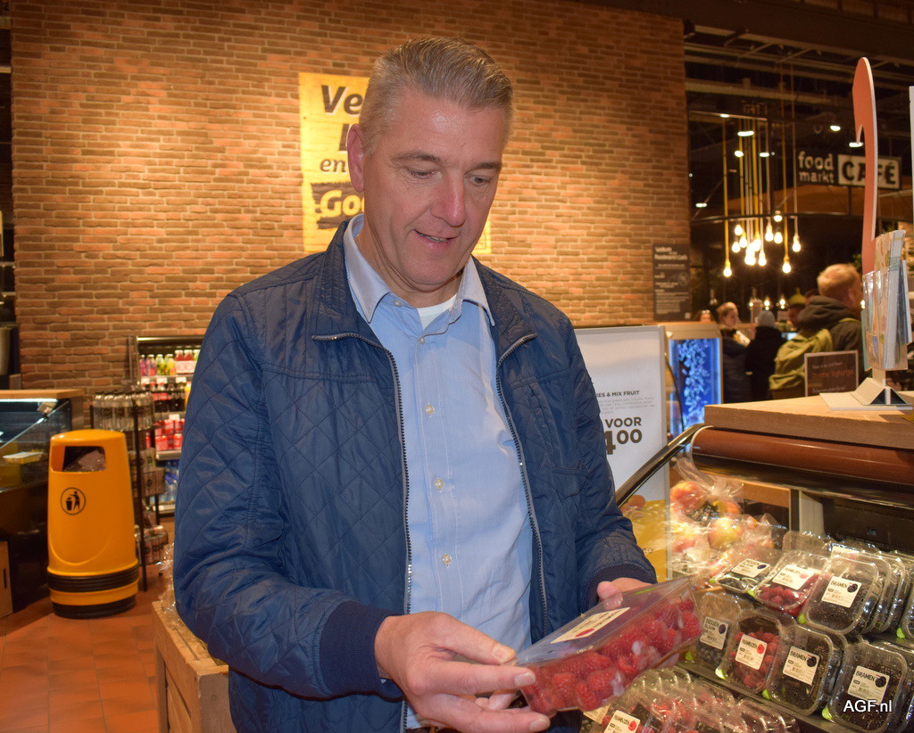 Rob van der Weele, manager zachtruit bij The Greenery demonstreert wat hij van neuromarketeer Tim Zuidgeest leerde: kijken naar een product, vestigt de aandacht op het product, in dit geval frambozen van The Greenery