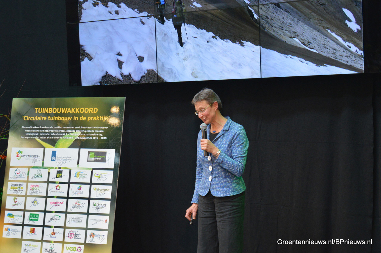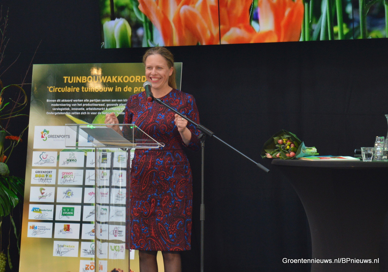 "Jullie zijn een makkelijke sector voor mij", grapt Carola Schouten tijdens haar openingsspeech, "want jullie houden vaak je eigen broek al op. Dat is makkelijk voor een minister. De tuinbouwsector", weer serieus, "wordt gekenmerkt door een echte hands-on mentaliteit".