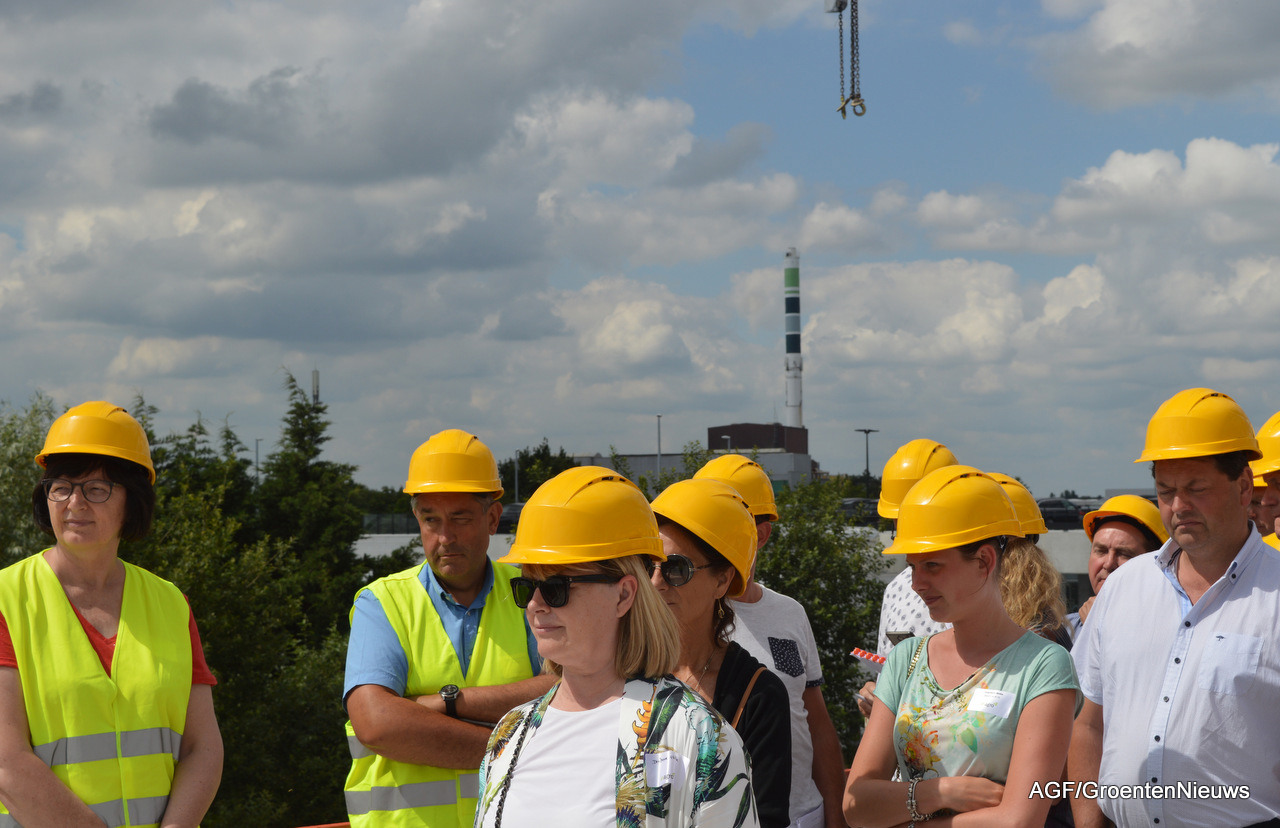 Wie tijdens de speeches over efficiënt gebruik van ruimte en energie achterom keek, zag de pijp van afvalverbrandingsoven MIROM die voor restwarmte gaat zorgen waarmee de kas verwarmd kan worden.