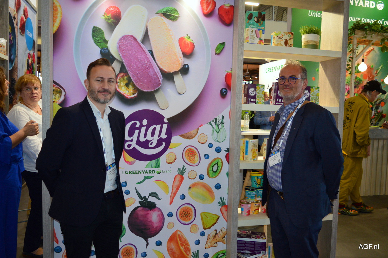 Lewis Hodgson en Kirsten Vanwildemeersch van Greenyard Frozen Belgium. Met het nieuwe merk Gigi. IJs gemaakt op basis van fruit en groenten.