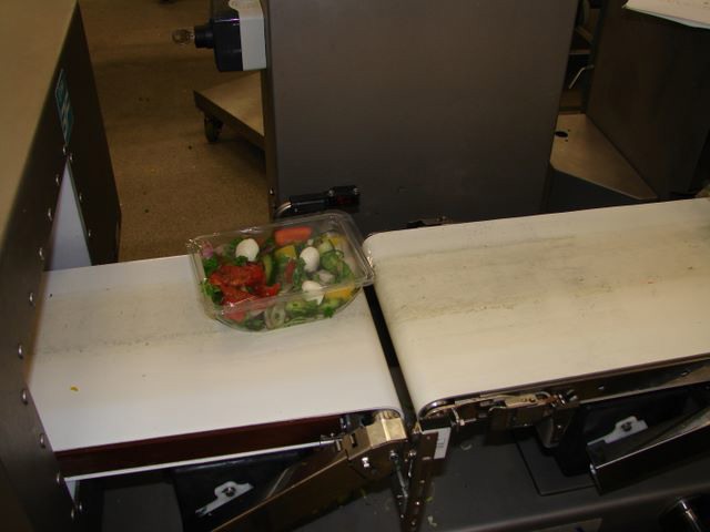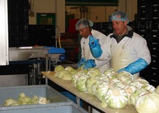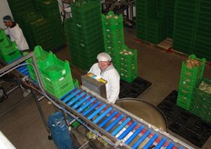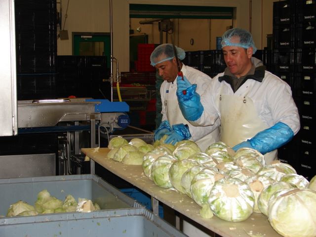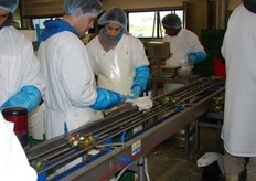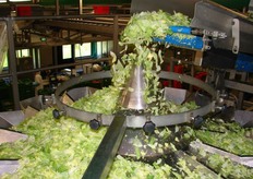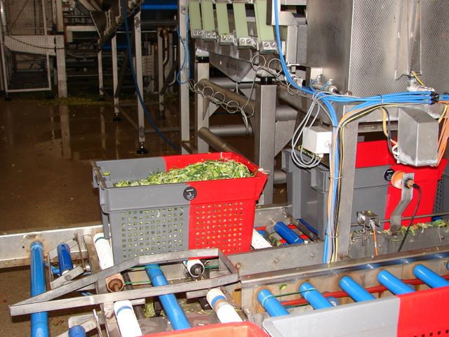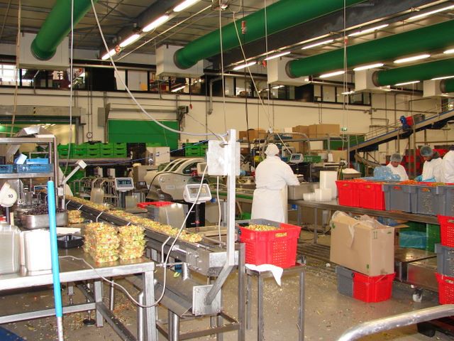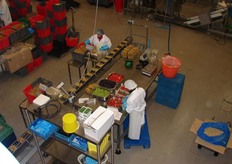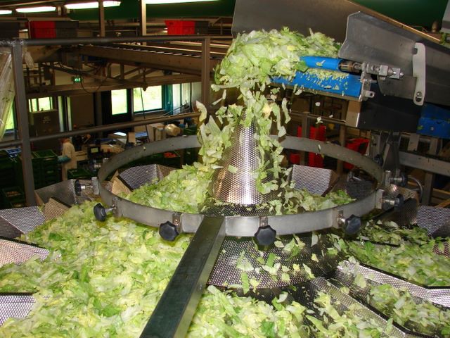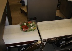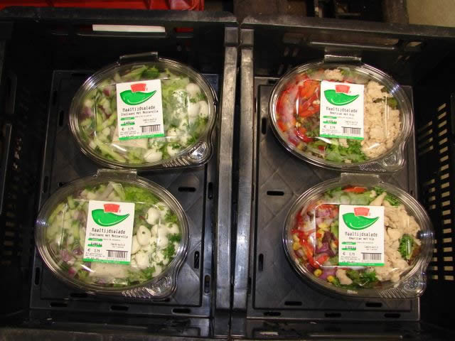 De bakjes kant-en-klare salade worden hier met de hand gevuld.