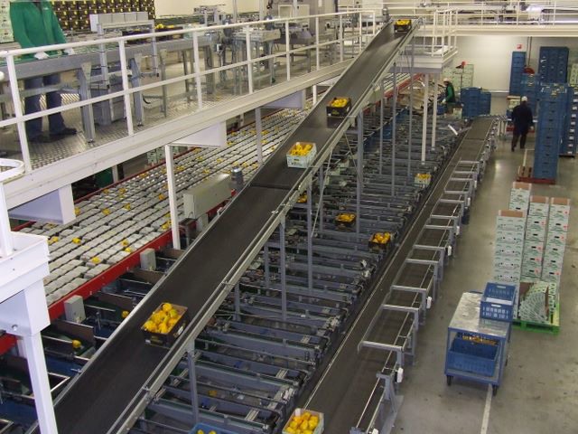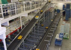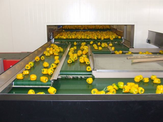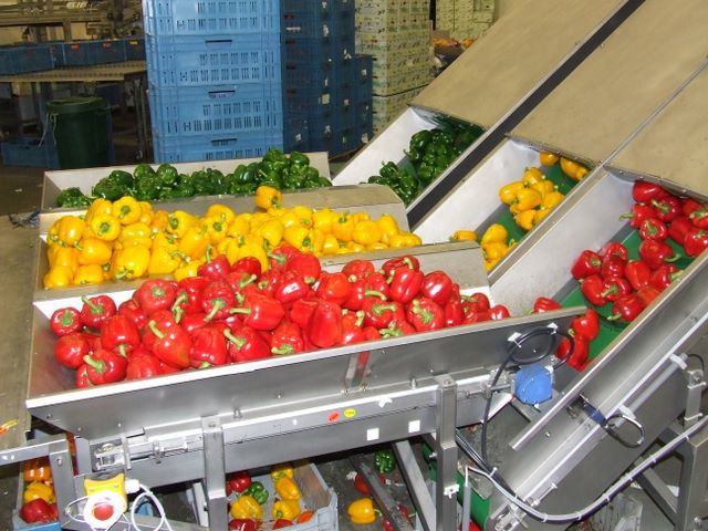 De paprika's worden gestort. De kantelbakken worden automatisch gekiept aan de andere kant van de muur.