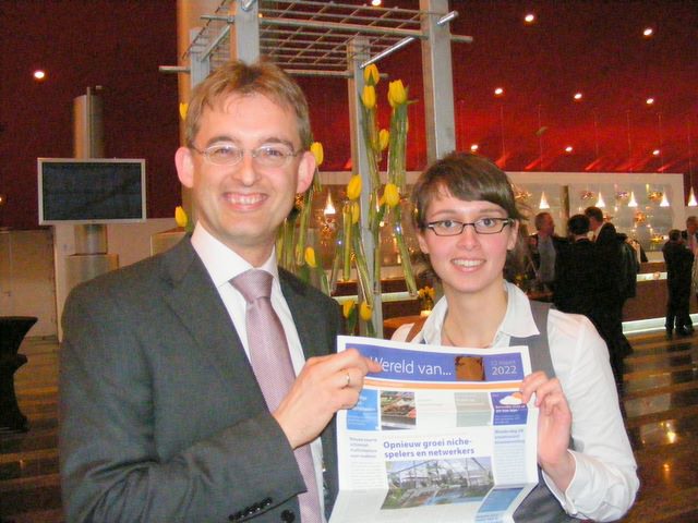 Dick Oosthoek overhandigt de eerste krant aan de voorzitter van NAJK, Jacqueline van der Burg.