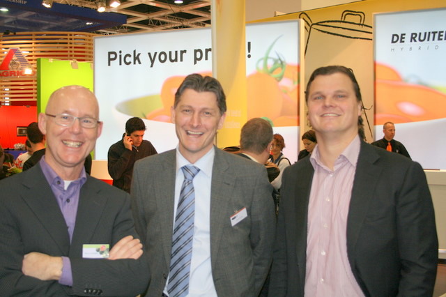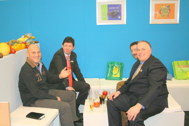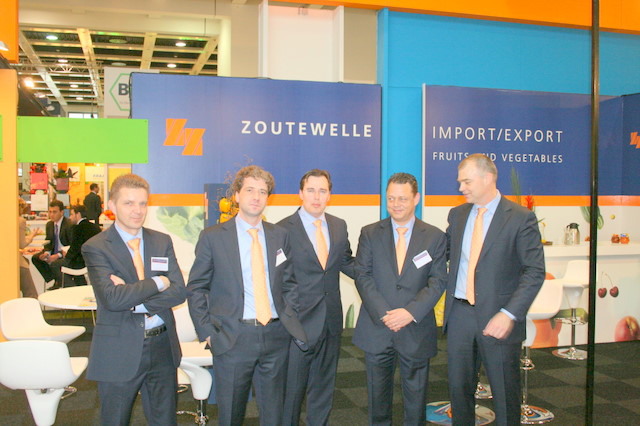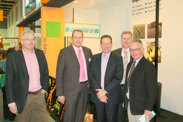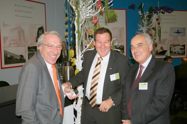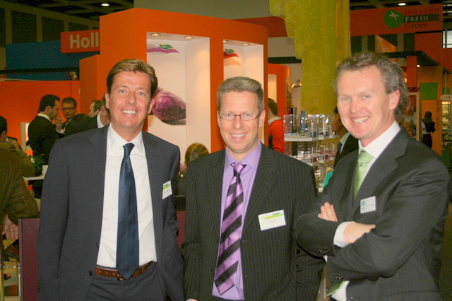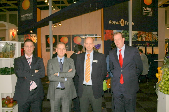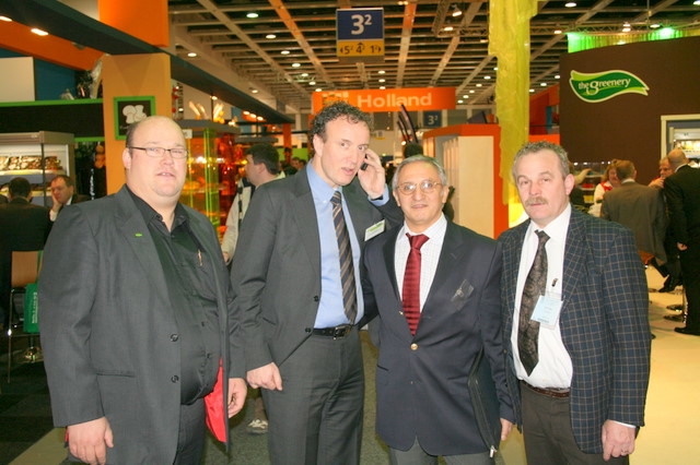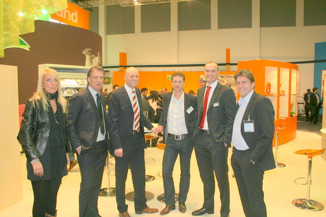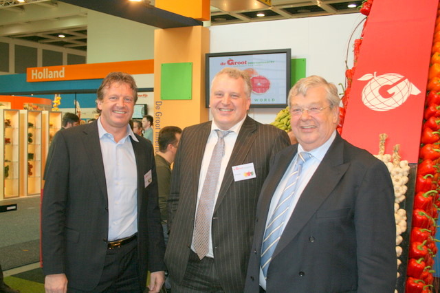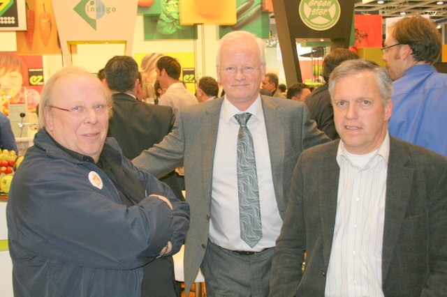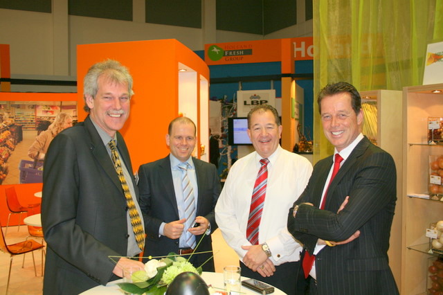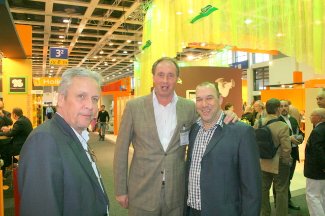 Otto Reimers (rechts) is al met pensioen, maar een Fruit Logistica laat je niet zomaar lopen. Hier samen met Ruud Ahsman en enkele collega's op de foto