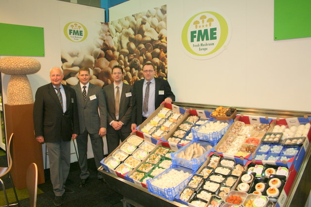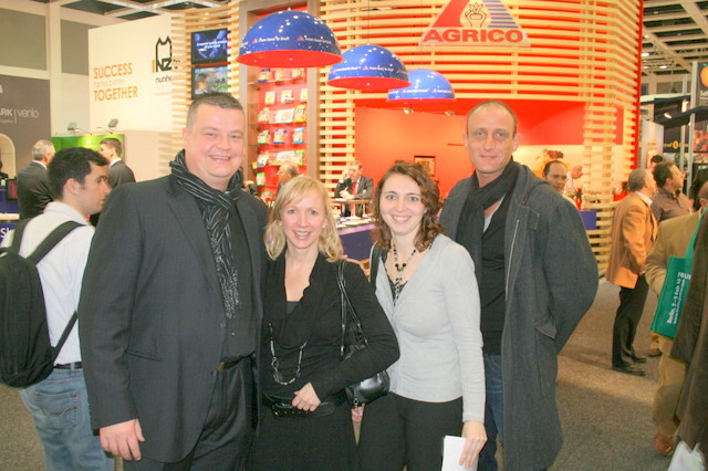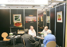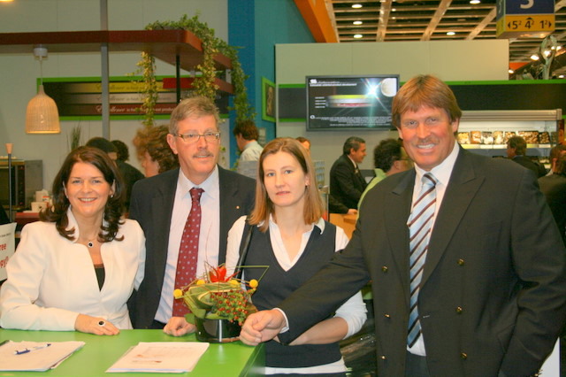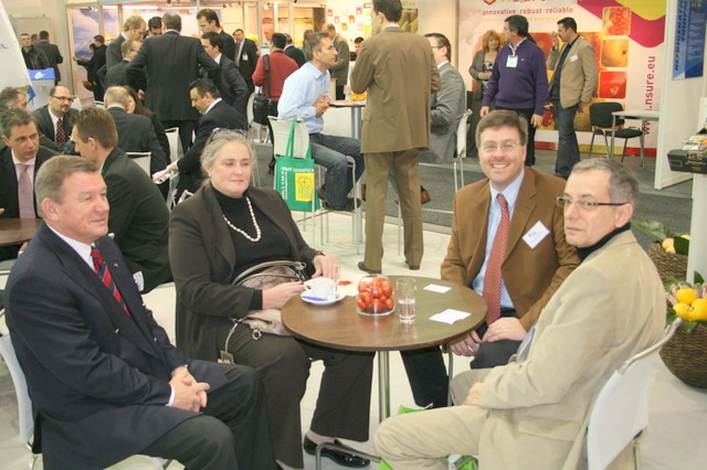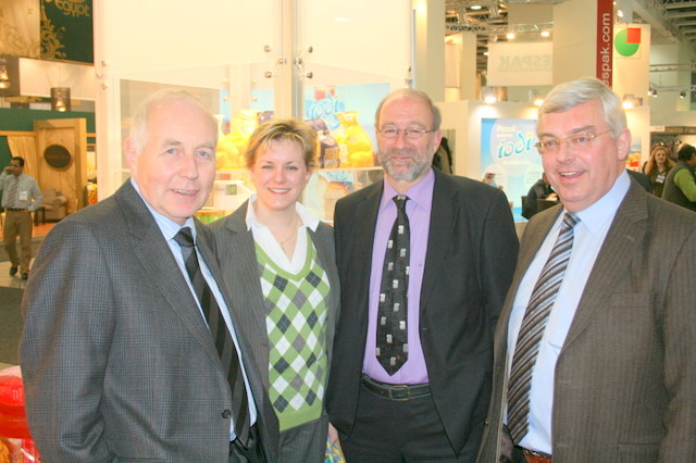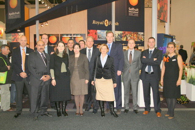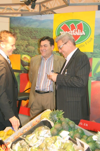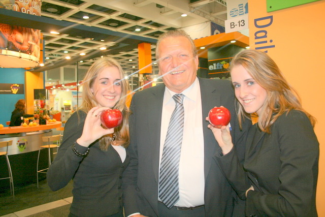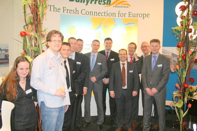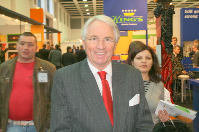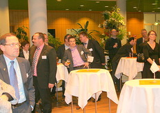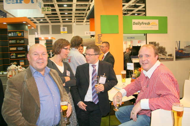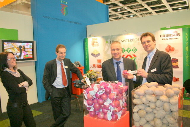 Otto Reimers (rechts) is al met pensioen, maar een Fruit Logistica laat je niet zomaar lopen. Hier samen met Ruud Ahsman en enkele collega's op de foto