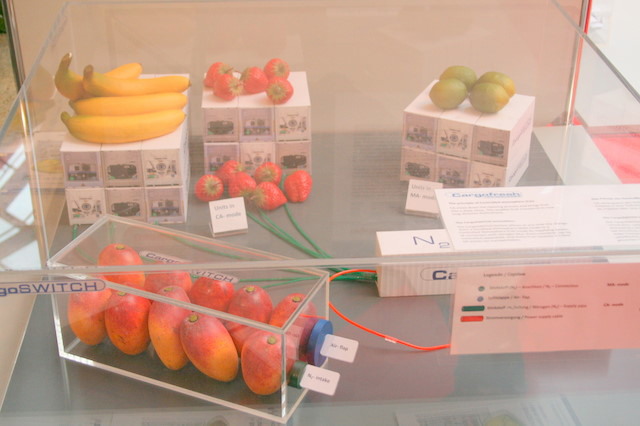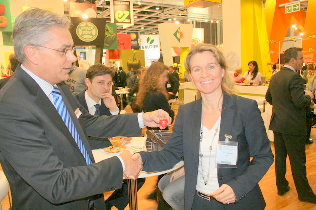 Leonard Kampschoer overhandigt aan Catrine van Bama een aardbei met een extreem lange shelf life.