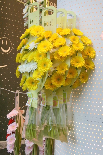 De fleurige stand van Fris-co. Achter de balie Sandra en op de achtergrond Oscar.