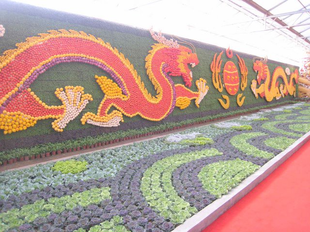 Typisch voor de Chinese beurs: in alle paden hangen diverse vruchten aan het plafond