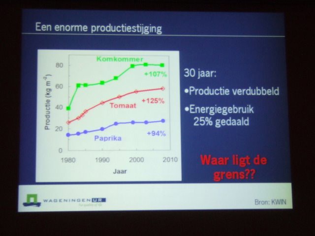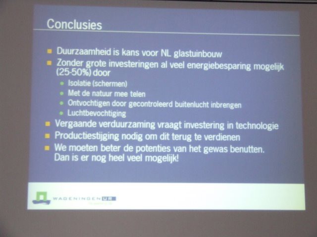 Lezing van Leo Marcelis (WUR) over de toekomst van duurzaamheid in de glasgroententeelt. Volgens Leo is er met geringe investeringen al heel wat mogelijk.