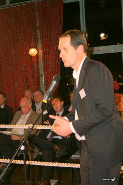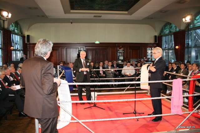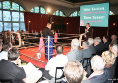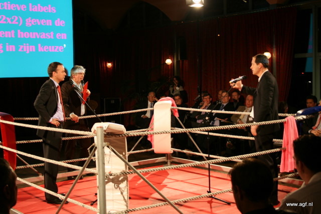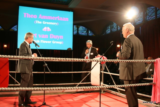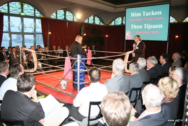 Wim Tacken (FrugiVenta) en Theo Tijssen (DPA) beten de spit af in de boksring tijdens het AGF-Debat 2010. De voorzitters blikten terug op 2009 en keken vooruit naar het nieuwe jaar.
