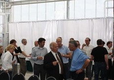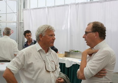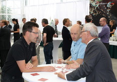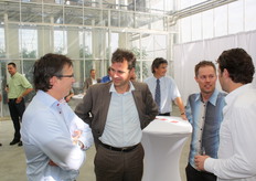 Bio-handelaren in gesprek. vlnr onder meer Jurgen van't Hoff (BioWorld), Gert Kogeler (Eosta) en Michel Groenewegen (2Organics)