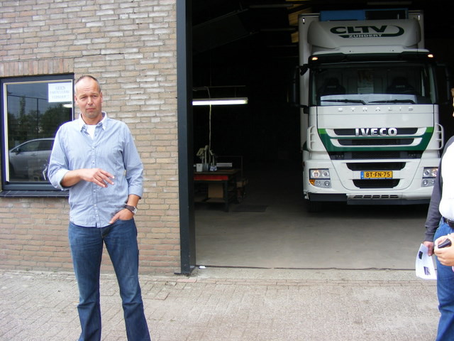 Mark van Aert voor de schuur, waar net een zending voor de veiling wordt geladen