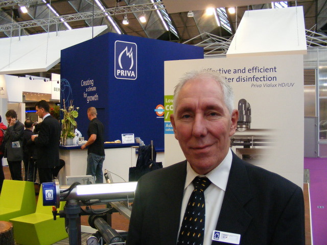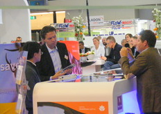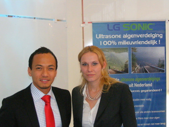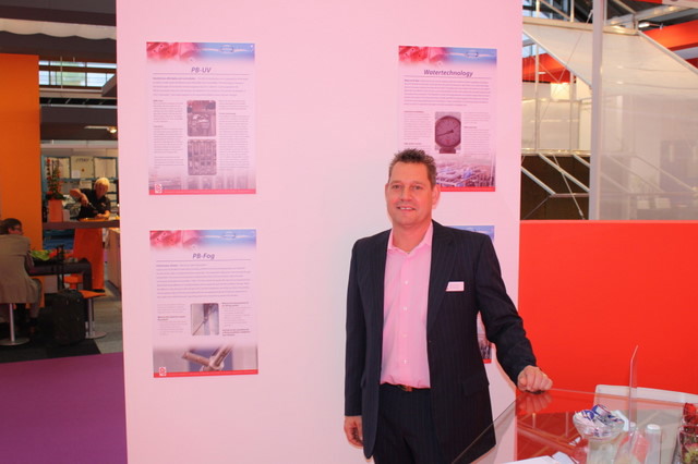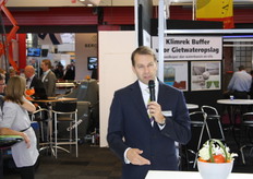 Chris Noordam vertelt in de stand van Viscon over de mogelijkheden van slateelt op water.
