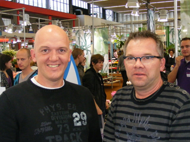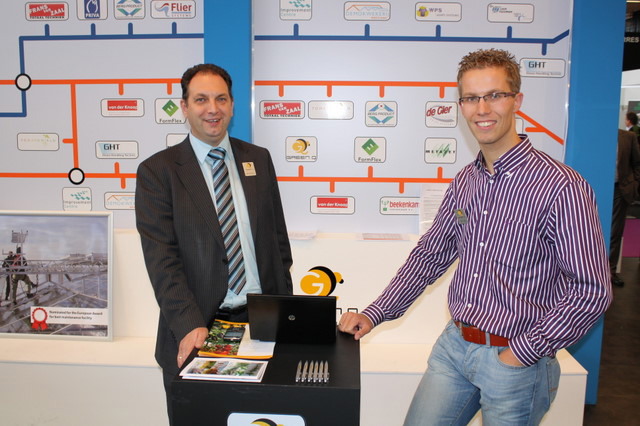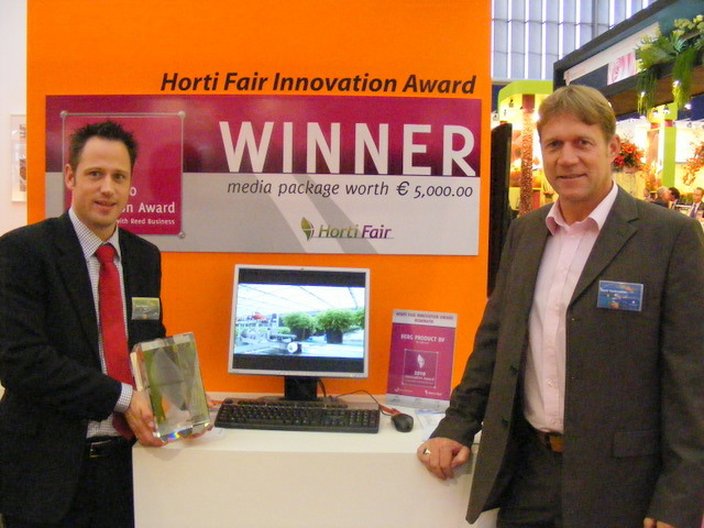 Mark Fikkers en RenƩ Verbraeken van Berg Product. Ze wonnen de Horti Fair Award met de Berg Band. Gefeliciteerd!