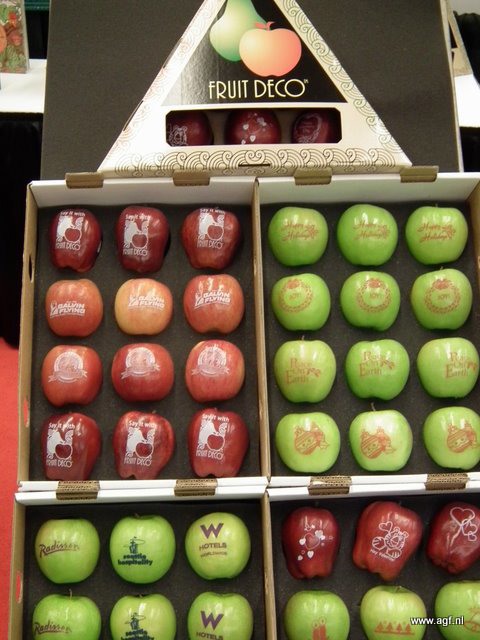 Fruit Deco kan iedere gewenste versiering op het fruit verzorgen. Het wordt er niet in gelaserd maar geprint