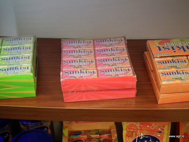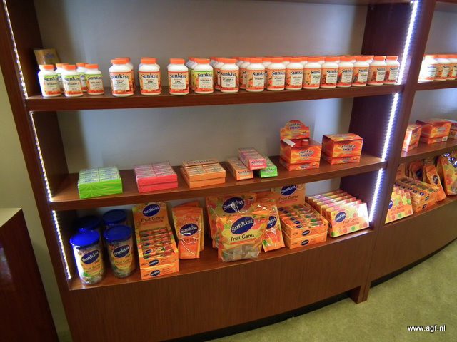 Sunkist gaat wel heel ver met het verwerken van citrus. De potjes bovenaan het schap is (sinaasappel) Vitamine C.