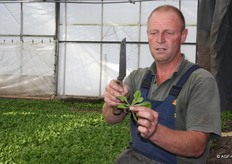 De Vocht snijdt met een plat mes, zodat ook een deel van de wortels wordt meegesneden.