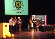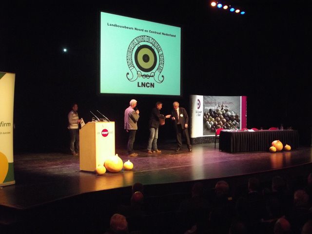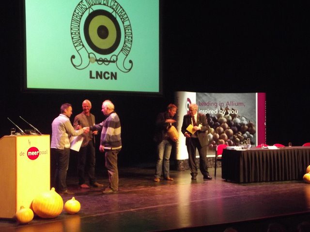 Ton van de Meeberg en Bauke Lettinga van Ten Brinke met een van de prijswinnaars van de uienwedstrijd Herman Schlepers.