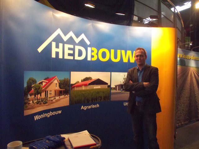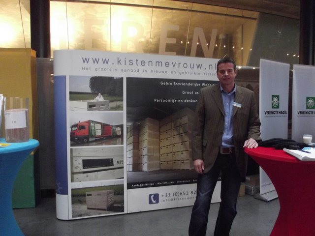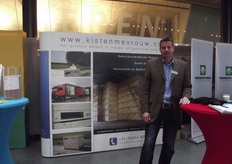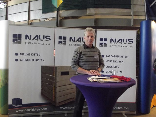 Sjaak Dudink bij de stand van Naus kisten en pallets B.V. onderdeel van Halbertsma pallets.