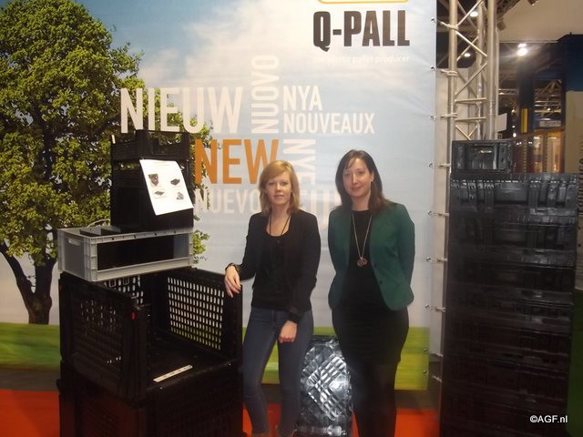 Ellen van Boxpall en Sabine Q-pall samen op de stand van Q-pall. Door samen te werken kunnen ze meer bieden aan de klanten.