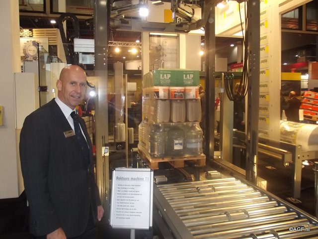 Dhr. Mulder presenteert de rekhoesmachine van Tallpack. Deze machines plaatst automatisch een hoes om de gehele lading.