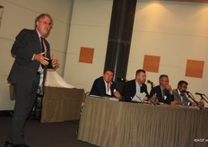 Romain Cools leidt het debat. Aan tafel V.l.n.r: Guy de Meyer (Demargro), Gino Vantieghem (Ruris), Vincent Marly (Pinguin) en Olivier Dauvers