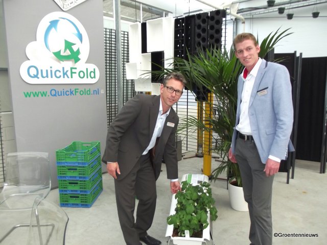 Jerry Arkesteijn en Joost van Ruijven van Beekenkamp Verpakkingen. Ze staan bij het Fragola reksysteem. Voor aardbeiteelten die naast extra hoogte en dus stuurbaarheid ook extra volume eisen is er nu de nieuwe fragolabak. Deze wordt gebruikt in de aardbeienteelt. De bak is te gebruiken in diverse systemen als table-top, op goten maar ook prima op lage dammen vanwege de optie voor trosopvang aan de bak. Deze substraatbak is gemaakt van PP-materiaal en stoombaar.