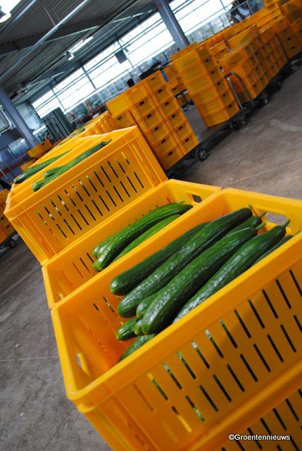 Met het transportsysteem gaan de komkommers automatisch tussen de tomaten door naar de verpakkingsruimte.