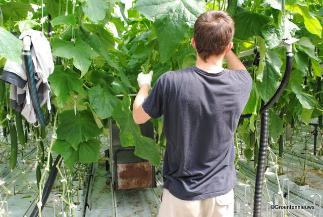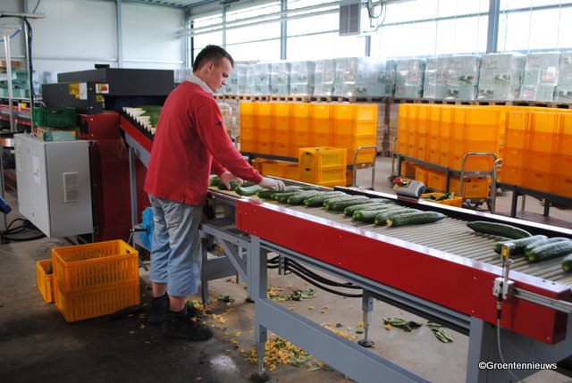 De sticker met daarop “Unsere Norden” wordt met de hand op de komkommers geplakt: ze zijn te klein voor het stickerautomaat. Best een karwei, maar de herkomst van het product is belangrijk om een meerwaarde te kunnen behalen.