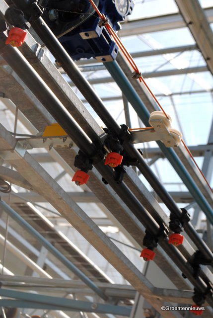 De kas is uitgerust met een dubbele scherminstallatie van Leen Huisman. Het tweede schermdoek is vereist voor de teelt van perkplanten. In de zomer wordt maar een scherm gebruikt. Bovenin de kas is het transportsysteem voor de perkgoedteelt te zien.