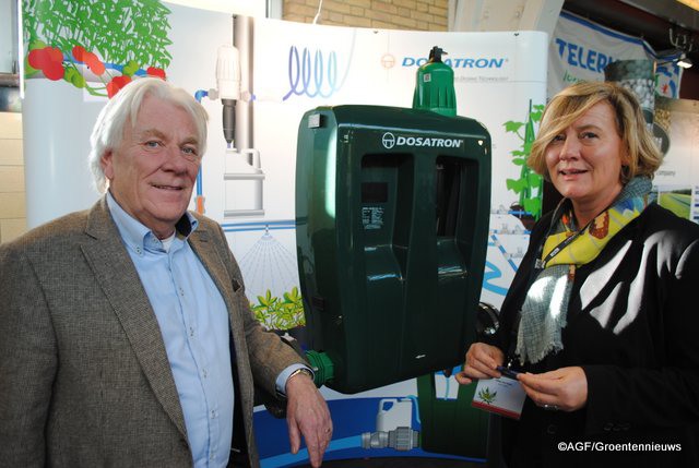 Links Bert van Herwijnen en rechts Hilde van Steijn van VeHa Plastics ze staan hier met de nieuwe Dosatron D-30. de D-30 is in aanvulling op de D-20.