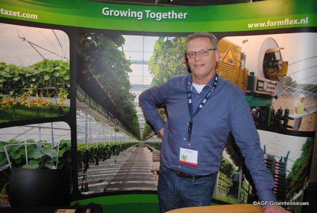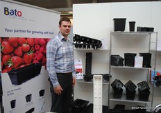 Edwin van Dorst van Bato plastics. Staan met 2 nieuwe aardbeientrays 1 van 12 gaats en 1 van 18 gaats en met hun nieuwe vierkante pot 7 liter.