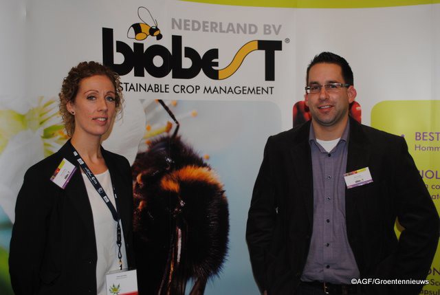 Irene van Schie en Bart Joosten van Biobest. Ze staan met de flying doctors. De hommels lopen door de schimmel preperaat en gaan met de schimmel aan hun pootjes naar de bloemen. Het gevolg is preventieve bestrijding van Botrytis.
