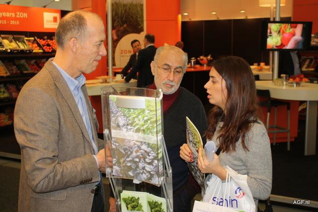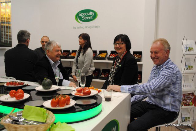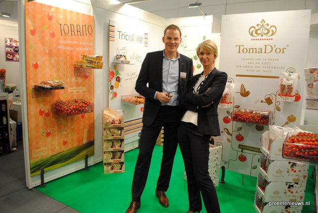 Voor het eerst zelfstandig op de beurs. Petra Veldman en Paul Stoffels van Stoffels Tomaten startten dit jaar met de eigen afzet. Gezien het vele bezoek op de stand is er veel belangstelling voor.
