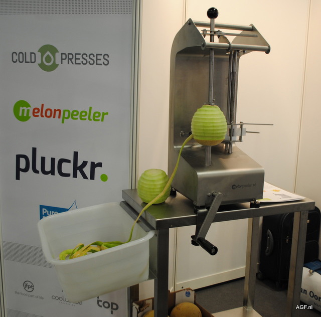 JFPT had een tweede stand op de beurs met de drie specials, namelijk de druivenonttrosser, melonpeeler en coldpress. Deze melonpeeler is voor het handmatig meloenen pellen met dezelfde snelheid als de duur volautomatische peeling, maar voor een fractie van de kosten.