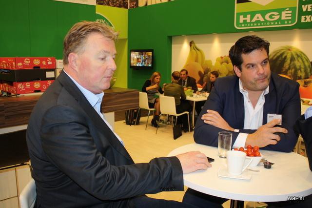 De nieuwe ZON-directeur Michiel van Ginkel in gesprek met Bas van Leeuwenvan Kwekerij Westburg, die partner is van een Marokkaans tomatenteeltbedrijf