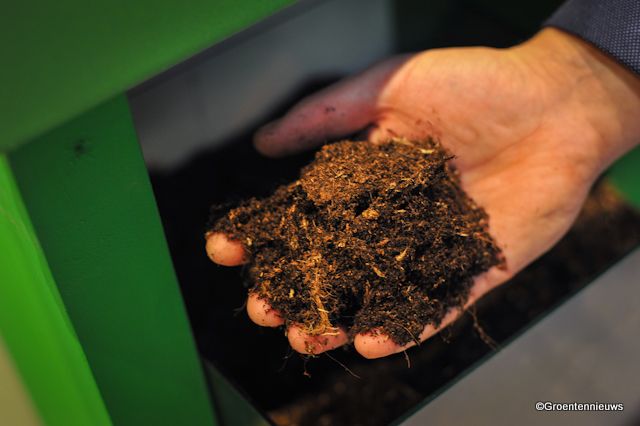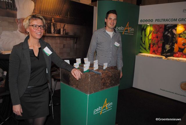 Els Thoelen en Hans Baekelmans van Peltracom bij de substraten van het bedrijf