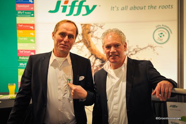 Sander Clemens en Marc de Bruin van Jiffy staan bij de nieuwe Long Casting Jiffy Pot met een uitgestelde vertering