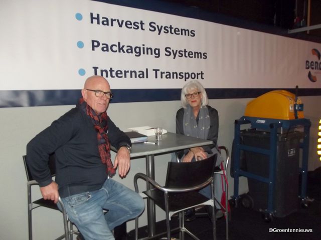 Peter Koneman en Wilma van der Lely van Priva. Priva timmert aan de weg met de Priva TopCrop gewasmonitor en MD/AV-desinfectiesysteem
