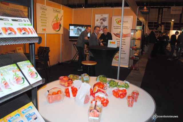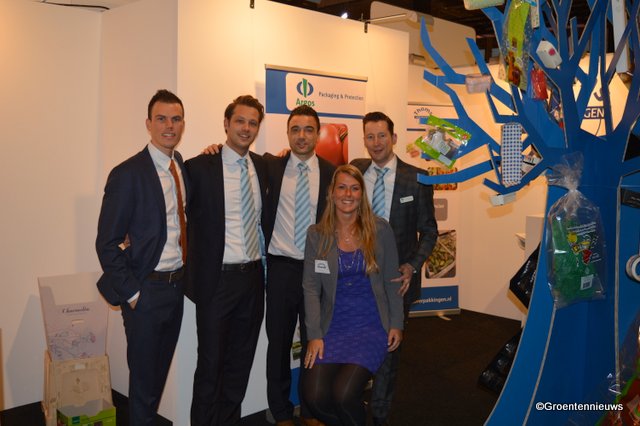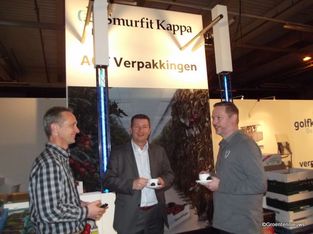 De verpakkingen van Freshpack waren fraai te zien in de stand. Evert-Jan Wassink, Daniel Tol en Rohan Ovens, de Australische gast, zitten in de stand
