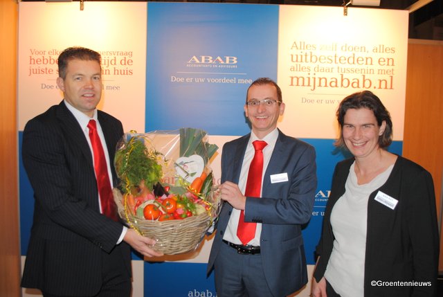Frank Buiks, Maarten van der Linden en Esther van de Wijngaard van ABAB Accountants. Hier kunnen de bezoekers raden hoeveel de groentemand weegt.