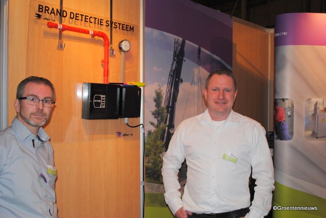 Arno Veldhuis en Maarten Cats van Alfa staan bij de nieuwe brand detectiesysteem