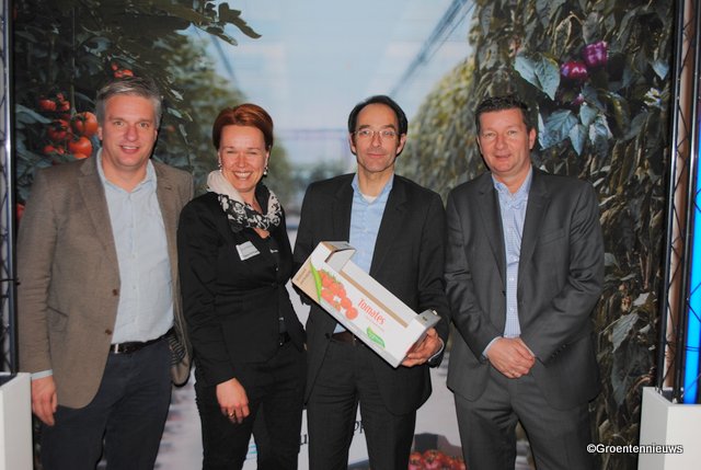 Michel Klaverdijk, Lyenne Nabuurs, Remy Notten en Lauran Jansen van Smurfit Kappa met hun nieuwe verpakking voor meer info: http://www.agf.nl/artikel/121676/Innovatie- The-Greenery-tomaten-verpakt-in-eigen-stengels