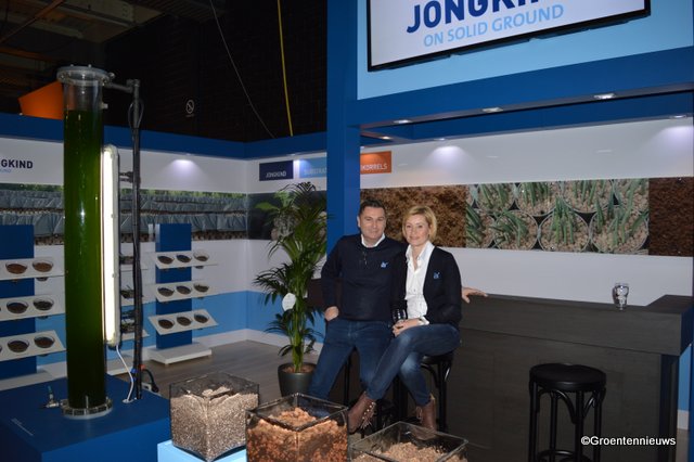 Meneer en mevrouw Jongkind van Jongkind BV. Links een buis waarin algen - die gebruikt worden als bodemverbeteraars - gekweekt worden.