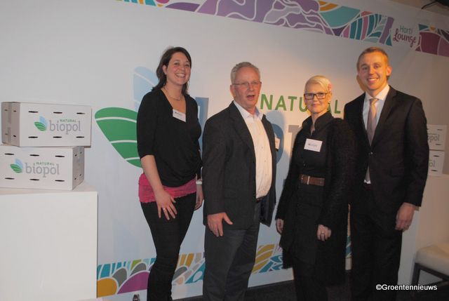 Imca van Tussenbroek, Huub Winters, Nancy Meijer en Mark Hoogendoorn laten de nieuwe producten van Biopol Natural zien.