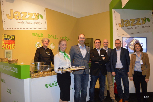 Jazzy promotie in Berlijn. Wassen, koken en genieten. Door de kok bereidde Jazzygerechtjes konden worden geproefd. Kok James, Eefje, Erik Oggel, Laurent Memetan, Johan van der Stee, Jan van de Werff en Elodie Bonnet.