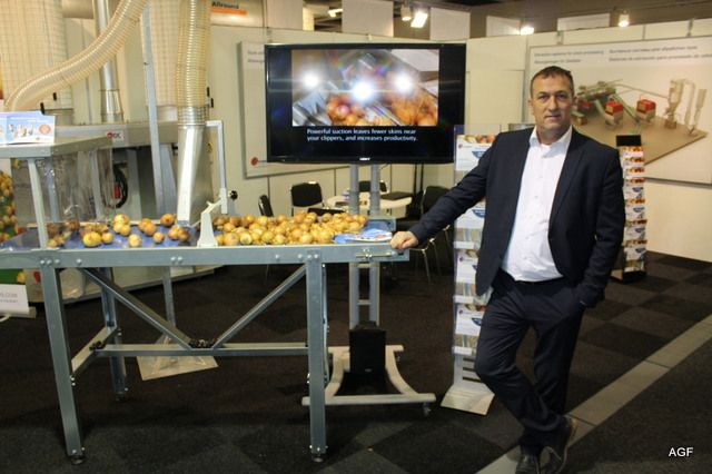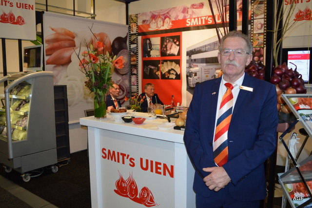 Kwaliteits uienproducten van Smit's uien. Uienproducten zijn leverbaar in diverse snits. Smits uien produceert haar producten voor veel Europese bedrijven waaronder de Retail. Op de foto Cock Lassche, op de achtergrond Jan Smit in gesprek met klanten.