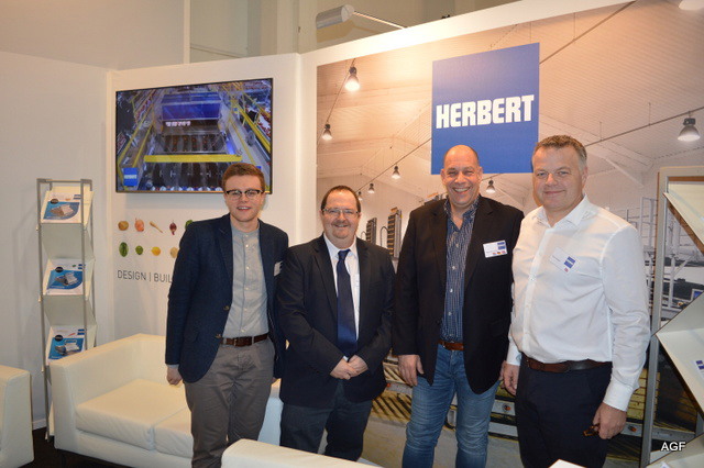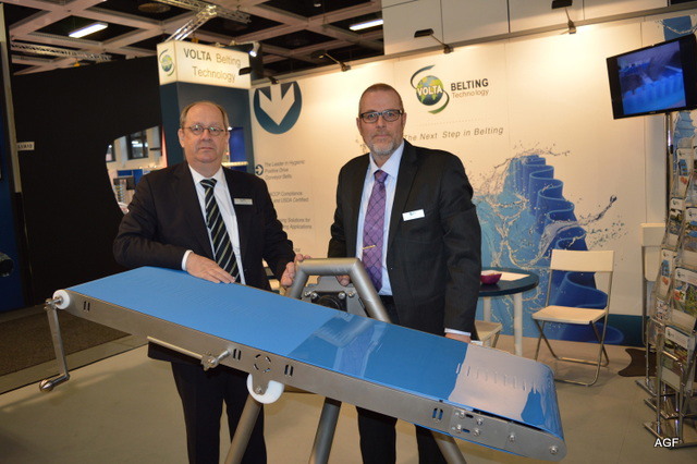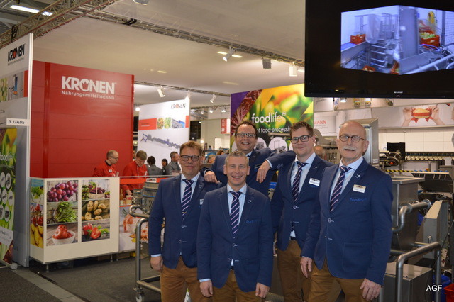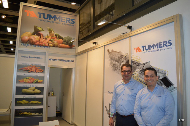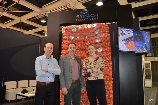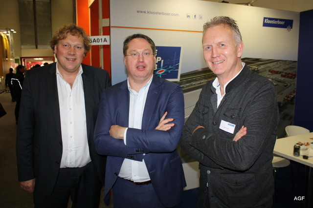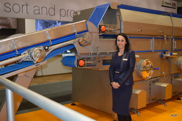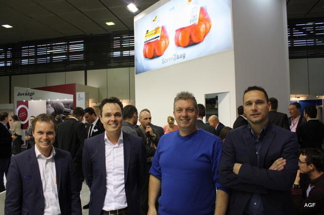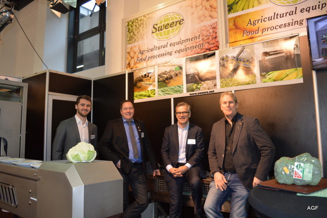 Triostand met Tolsma, Kiremko en Concepts. Denieuwe slogan van Kiremko is: ‘Together we know to store, wash, sort ans proces’. V.l.n.r. Vincent Hofstee van Tolsma, Bethe Benschop en Nicole Peters van Kiremko, Eloa Ritzer van Tolsma, Rob Bornstein en Peter Eijsbouts van Concept Engineering
