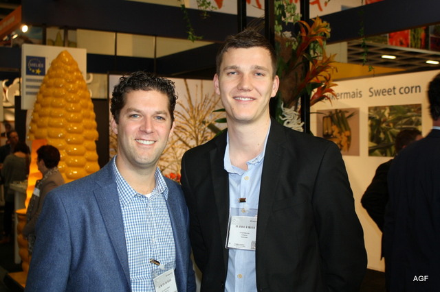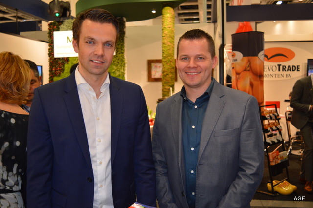 Het online handelsplatform Click4Fruit.com gaat binnenkort van start. Steven van Dijk (links) en Michael Boässon (rechts) trakteerden de bezoekers in de stand op zelfgebakken stroopwafels