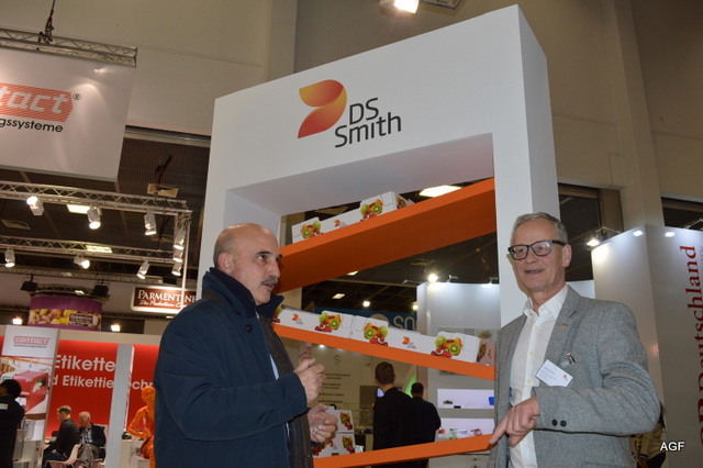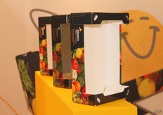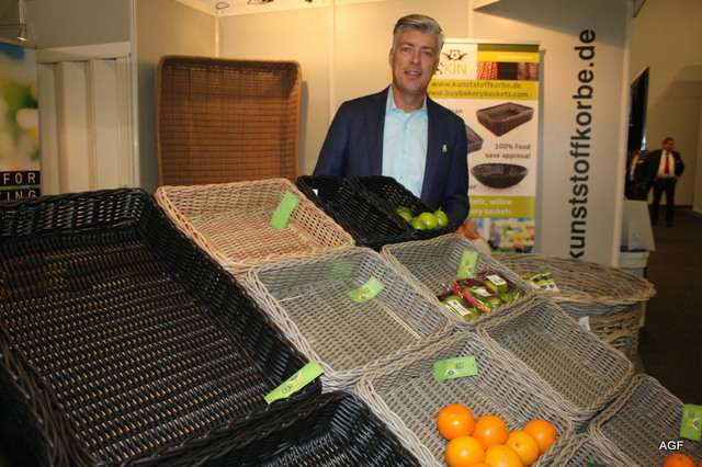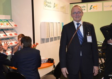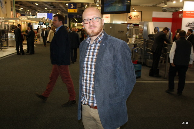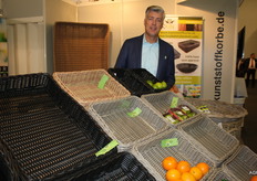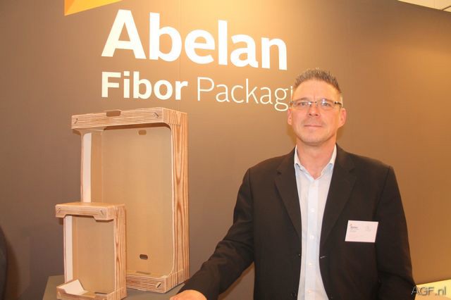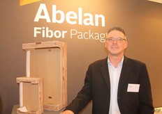 Oliver Wendt van Abelan Fibor Packaging. Op de beurs werden de nieuwe dozen met houtlook gepresenteerd.